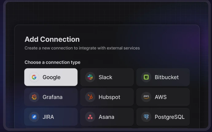 Conecte las herramientas que ya usa y sus sistemas internos para impulsar la aplicación con datos reales. Las credenciales se almacenan de forma segura y el acceso se puede limitar por rol. Su equipo obtiene los datos correctos sin tener que copiarlos en hojas de cálculo.